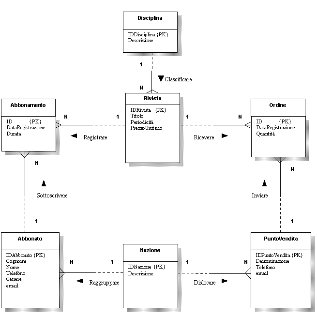 Il legame tra abbonato e rivista è rappresentato dalla stipula di un abbonamento, mentre il legame tra punto vendita e rivista è rappresentato dall’ordinazione.